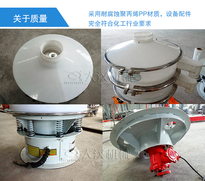好的質(zhì)量能夠讓您的設(shè)備使用更長久,減少后期維修費用,而且設(shè)備在篩分效果上也是有別于劣質(zhì)設(shè)備的,大漢化工振動篩采用耐腐蝕聚丙烯PP材質(zhì),完全符合化工行業(yè)的要求,設(shè)備在做工上也是相當精細的,所有設(shè)備配件的選擇均按照化工行業(yè)的安全標準,設(shè)備使用更安全。