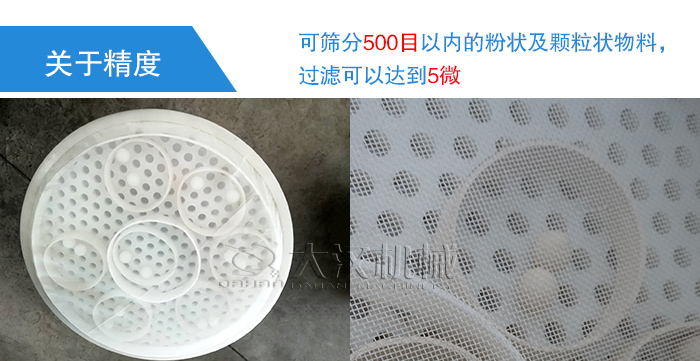 可以篩分500目以內(nèi)的粉狀及顆粒狀物料,過濾可以達到5微米,而且我們的化工振動篩還可在篩面加裝彈跳球,可江都物料堵孔問題,提高篩分精度。