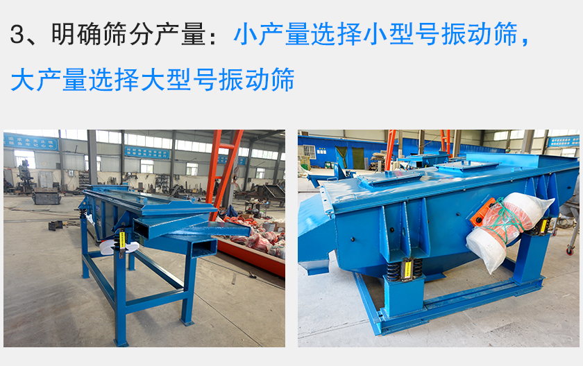 用戶對于振動(dòng)篩類型已經(jīng)有了充分的把握,那么接下來就是振動(dòng)篩型號的選擇,而與型號相關(guān)的數(shù)據(jù)就是產(chǎn)量了,所以需要用戶告知篩分產(chǎn)量,從而確定振動(dòng)篩型號。