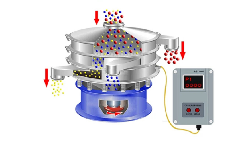 石墨粉超聲波振動(dòng)篩設(shè)備啟動(dòng)后,雙振動(dòng)電機(jī)產(chǎn)生對(duì)稱激振力,帶動(dòng)篩框做直線或圓形振動(dòng),使進(jìn)料口落入的石墨粉沿篩面均勻滑動(dòng),符合目數(shù)要求的細(xì)粉透過篩孔進(jìn)入下層,粗雜顆粒則從排渣口排出,完成基礎(chǔ)分級(jí)。同時(shí),超聲波發(fā)生器輸出 20-38kHz電信號(hào),經(jīng)換能器轉(zhuǎn)化為機(jī)械振動(dòng)并傳遞至篩網(wǎng),高頻振動(dòng)快速擊碎 200-1800 目石墨粉的團(tuán)聚體,實(shí)時(shí)清除篩孔堵塞。兩種力互不干擾,振動(dòng)保障篩分效率,超聲波解決堵網(wǎng)難題,最終實(shí)現(xiàn)石墨粉的粒度分離。